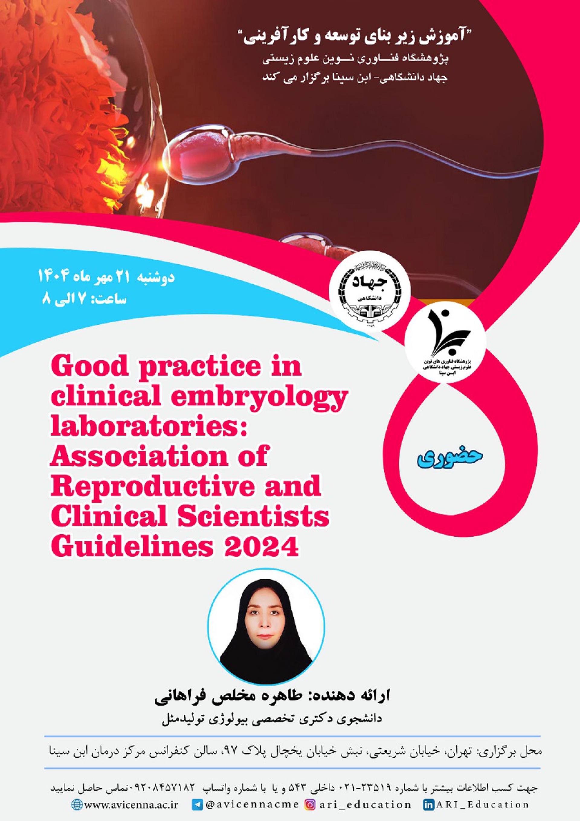 محل برگزاری: تهران، خیابان شریعتی، نبش خیابان یخچال، پلاک 97، مرکز فوق تخصصی درمان ناباروری ابن سینا، سالن کنفرانس مرکز درمان ناباروری ابن سینا